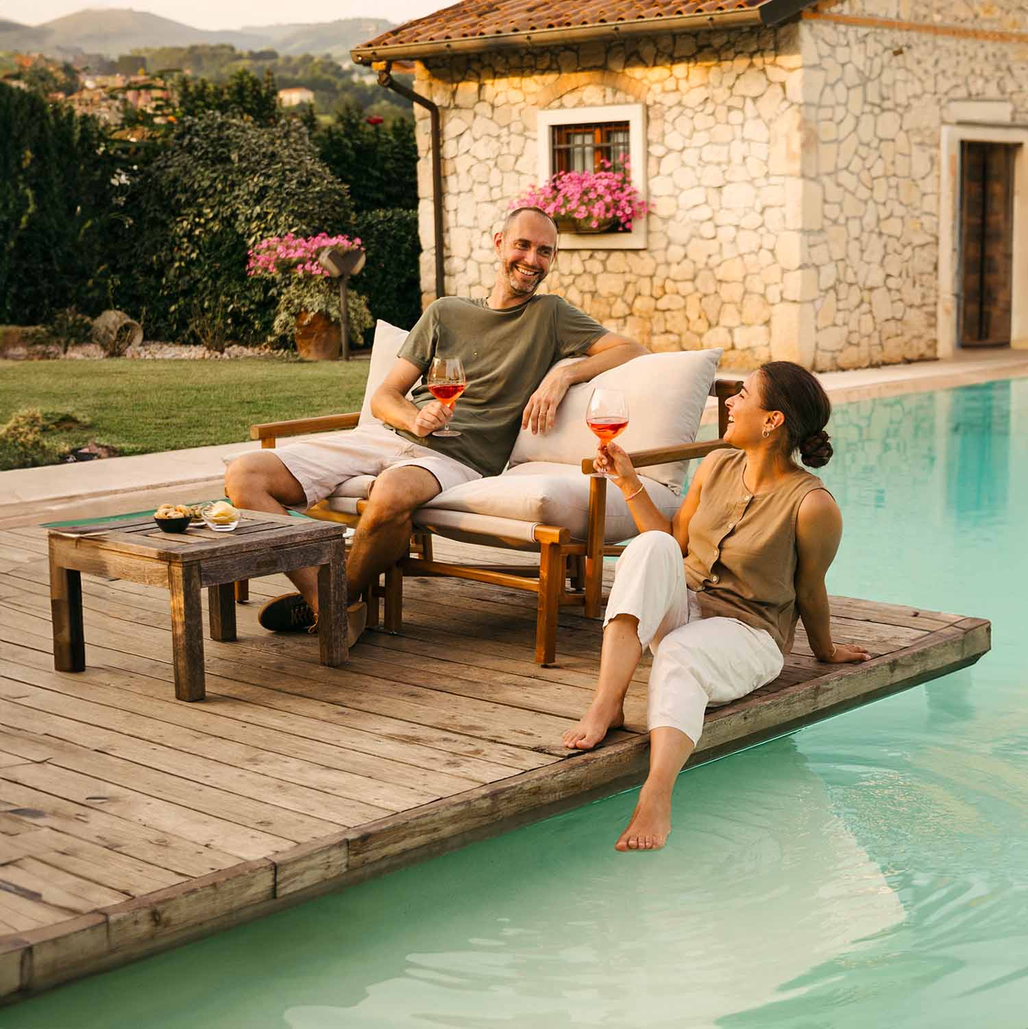 Ruimtes voor persoonlijk comfort en rust, met ligstoelen en fauteuils die je uitnodigen om te vertragen en van het moment te genieten.