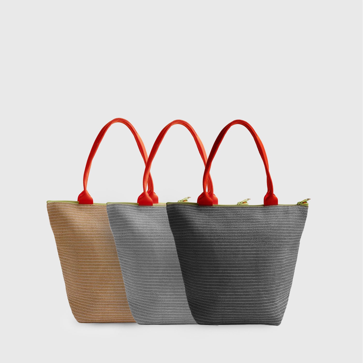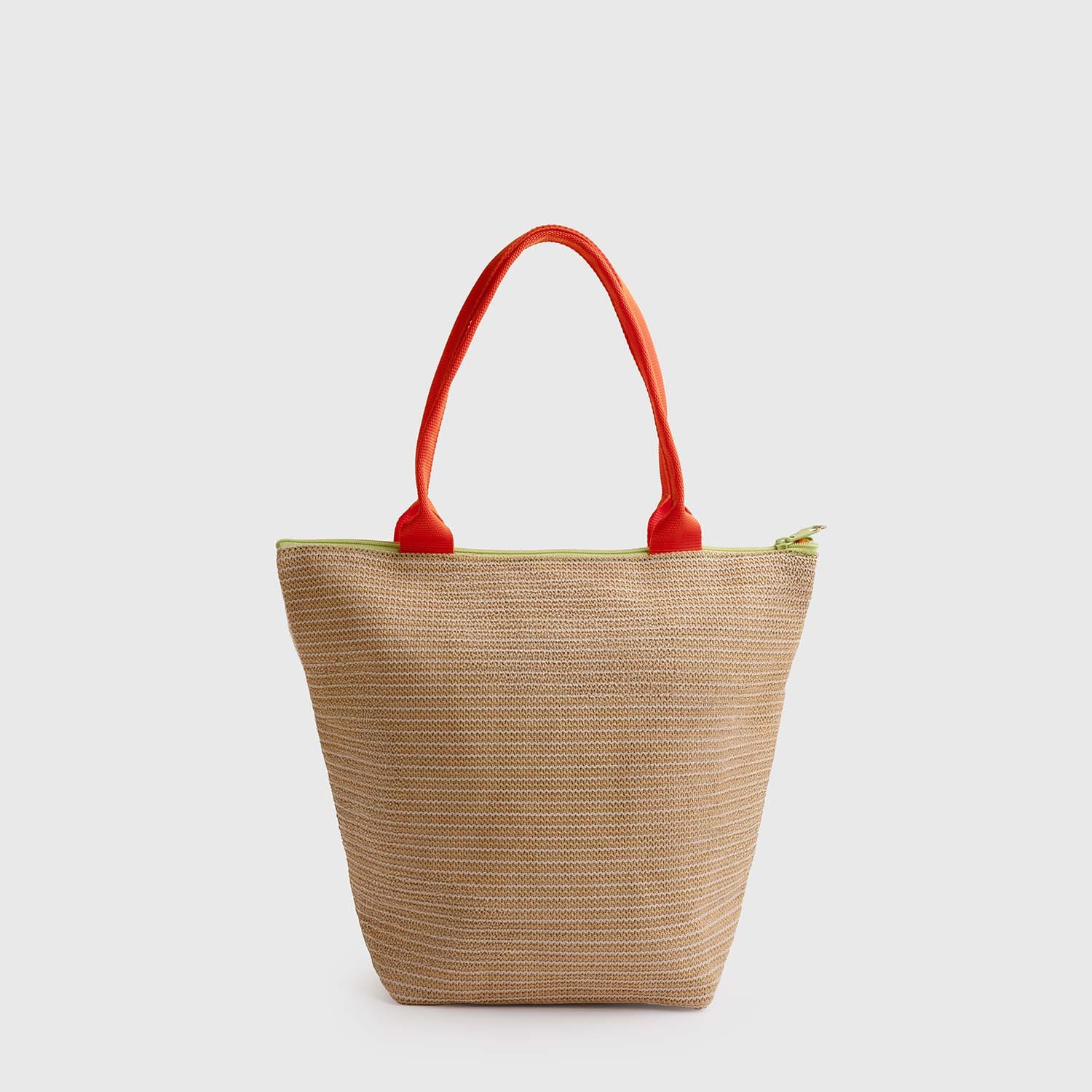 Tweekleurige tas met oranje inzetstukken en groene en blauwe details, comfortabele stoffen handvatten, ritssluiting aan de bovenkant.