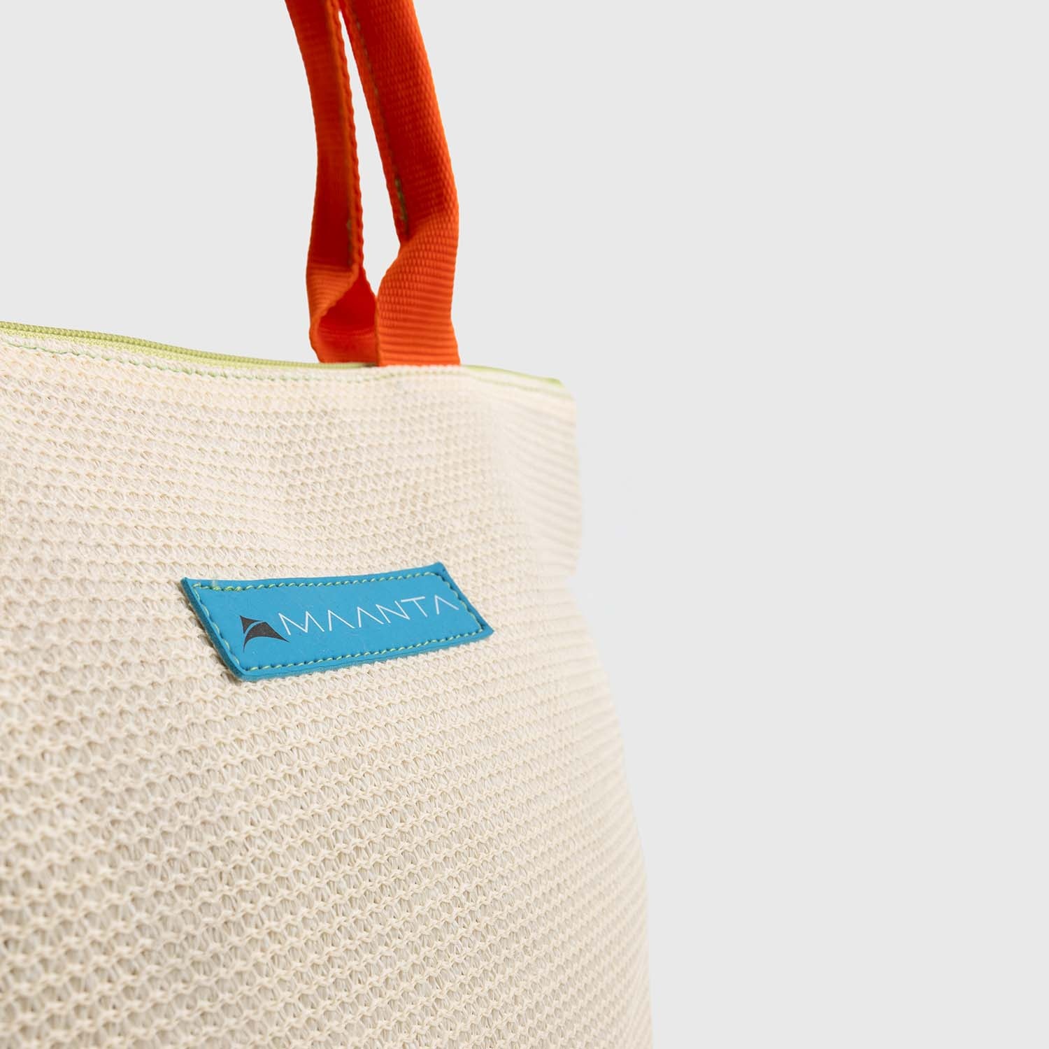 De buitenstof is ons Meshnet 320g, een extreem sterk geweven nieuw polyethyleen dat we gebruiken voor de productie van onze handgemaakte zeilen. Geselecteerd voor perfecte hittebescherming en windweerstand, wordt het nu een grote, comfortabele, zachte tas met een duurzame basis om het gewicht van een dag weg van huis te dragen en vooral perfect om naar het strand te gaan.
