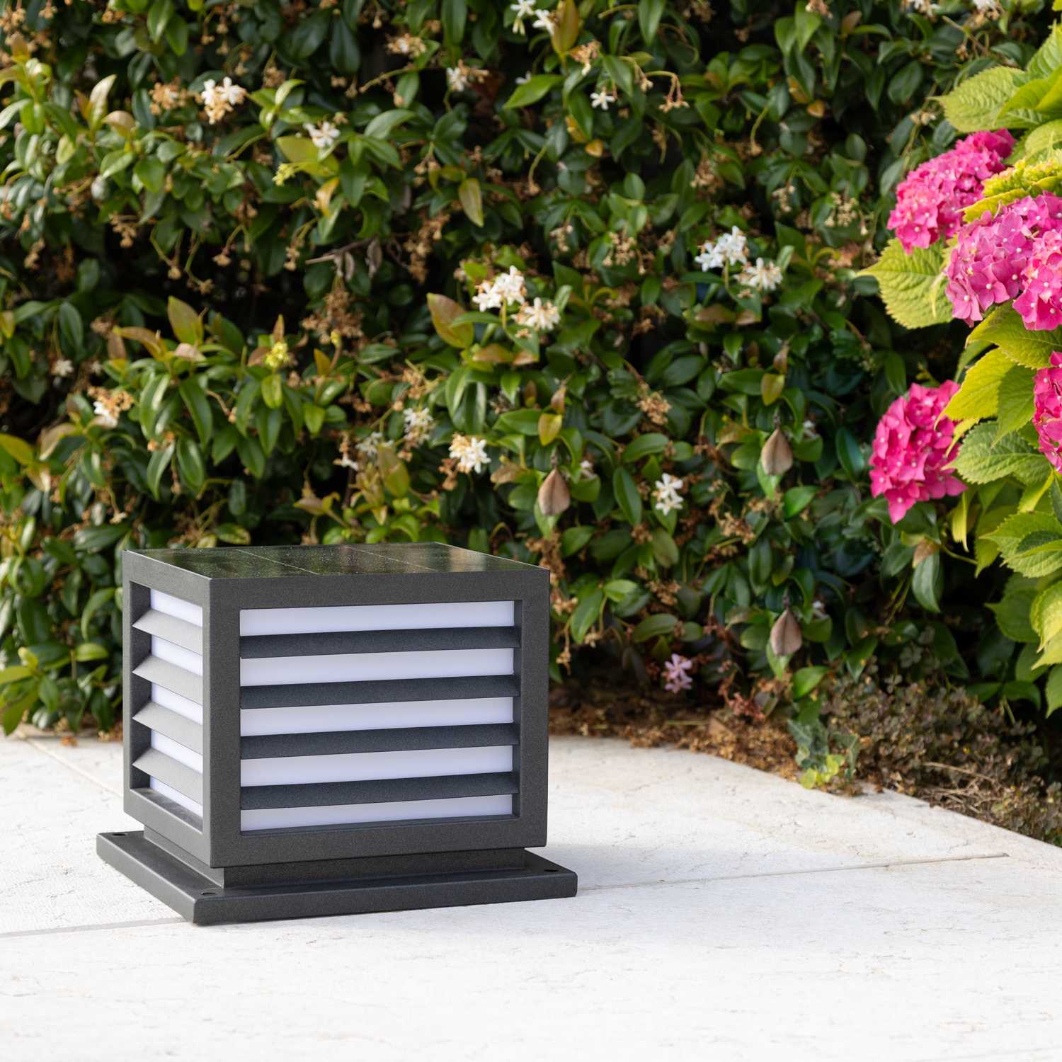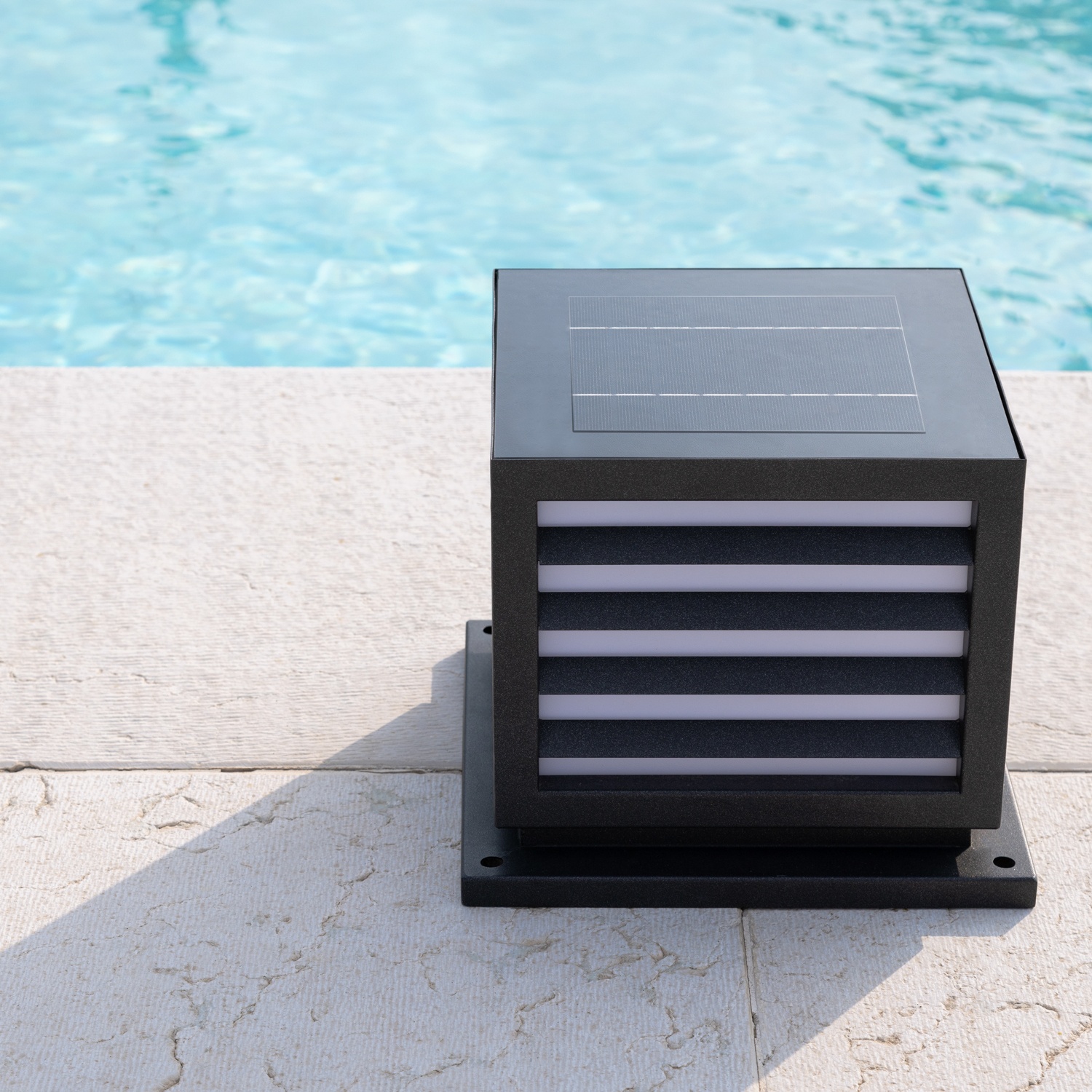 Solar QUB is de zelfstartende buitenlamp met geïntegreerd zonnepaneel en lithiumbatterij.