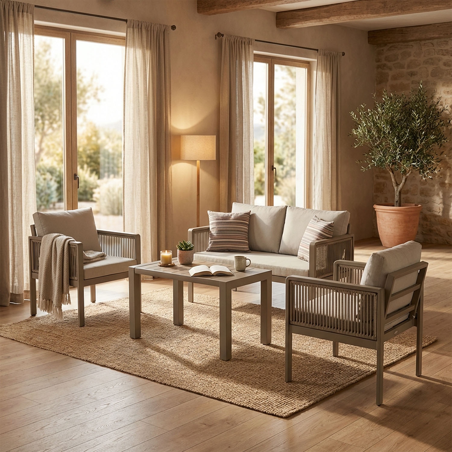Genova is een loungeset voor buiten, bestaande uit een 2-zitsbank, twee losse fauteuils en een lage salontafel. Het frame is gemaakt van gepoedercoat aluminium in taupekleur, met met de hand gevlochten olefin touw op de armleuningen en rugleuningen. De kussens zijn uitgevoerd in waterafstotende Olefin-stof met een vulling van dichtheid 28, ideaal voor comfortabele momenten in Nederlandse tuinen en op terrassen.