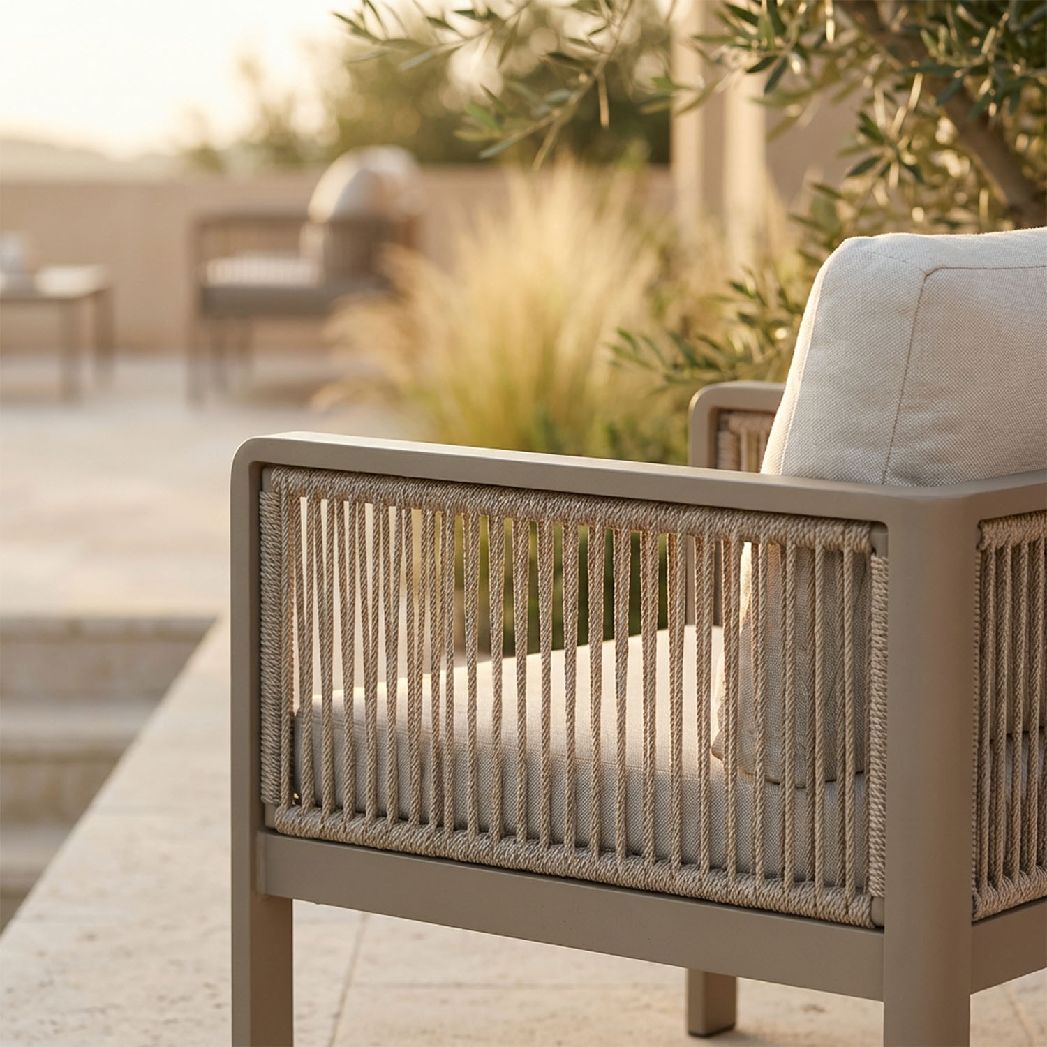 - Met de hand gevlochten olefin touw: ambachtelijke structuur die zachtheid, volume en UV-bestendigheid toevoegt aan het frame