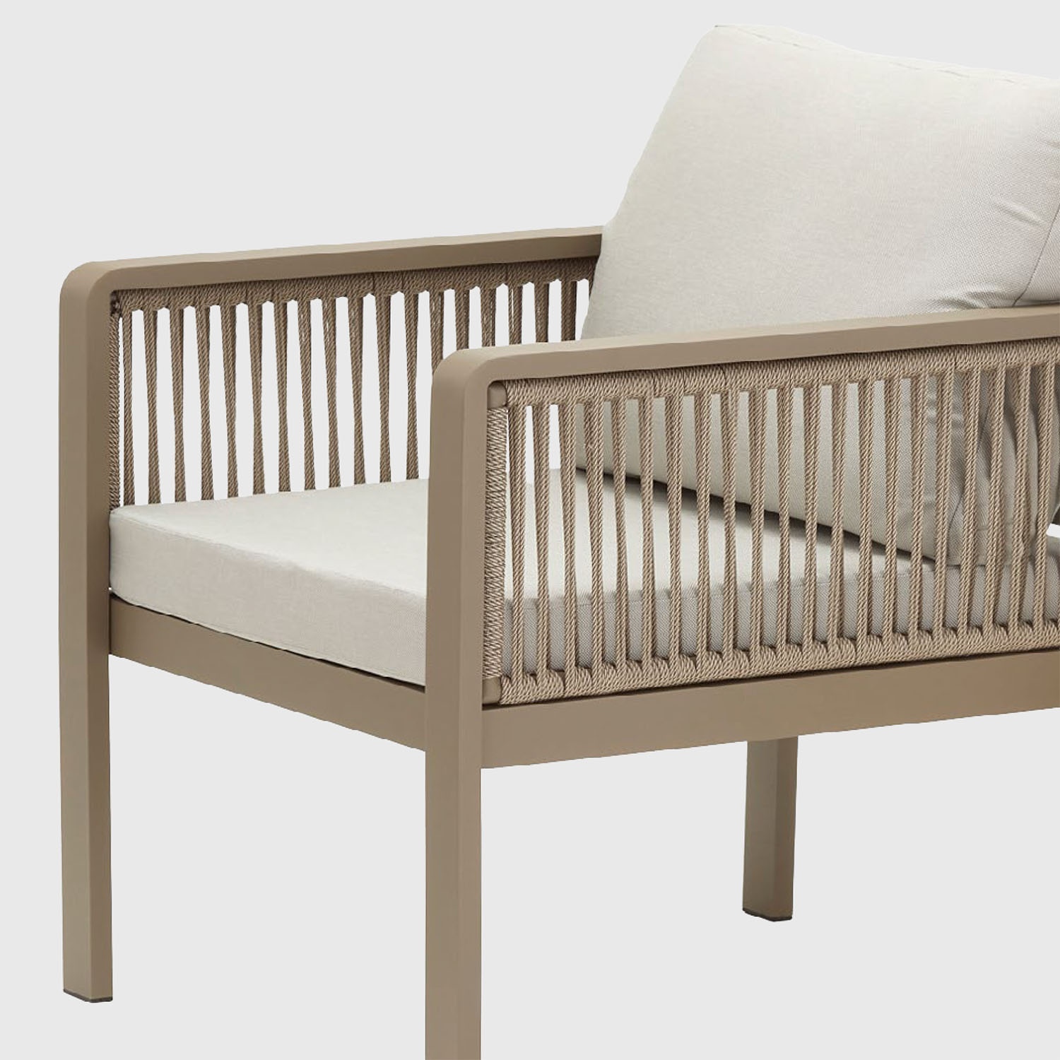 Elke meter olefin touw wordt met de hand rond het aluminium frame gevlochten, waardoor een rugleuning en armleuningen ontstaan met eigen volume en zachtheid. Het touw werkt als een net: ondersteunt, omsluit, ademt. Het is geen decoratie, maar een actief structuurelement.