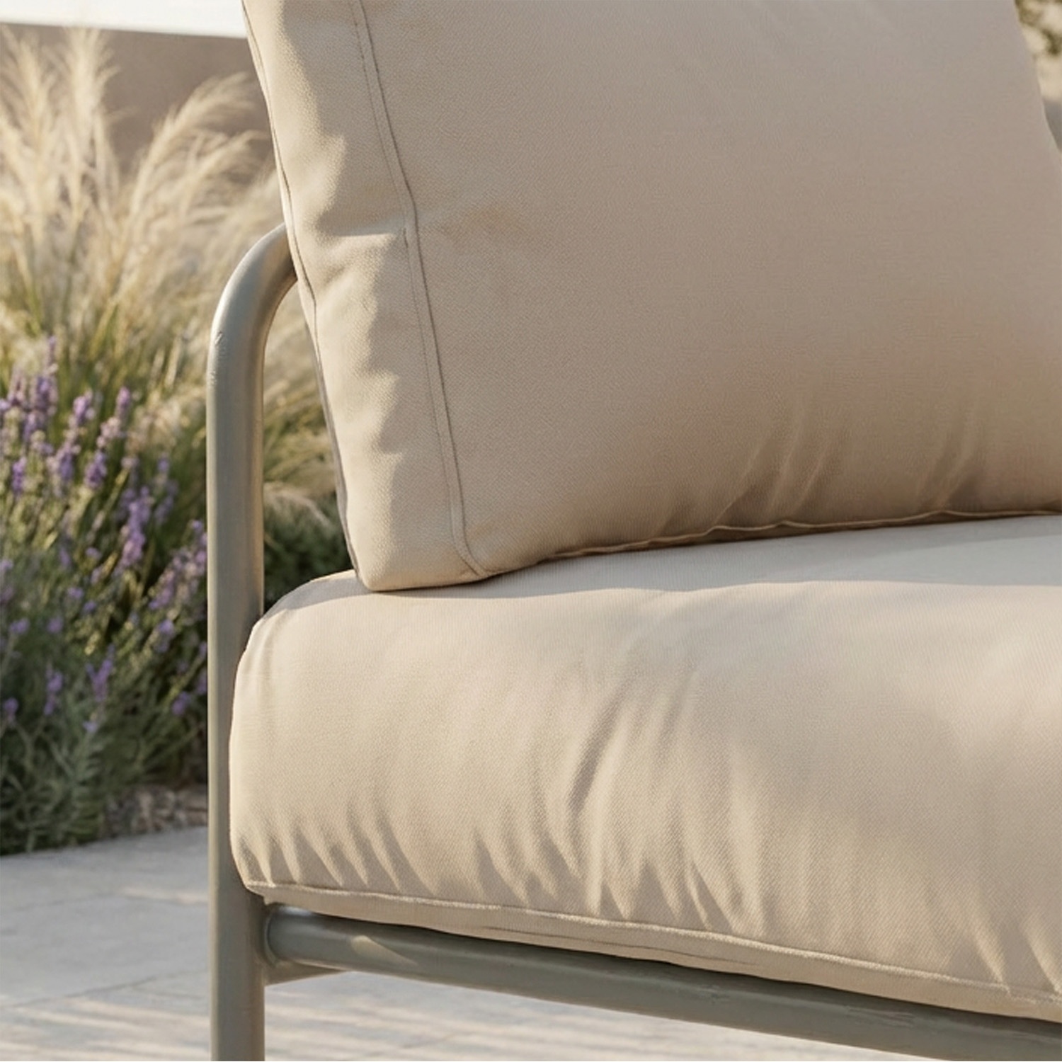 De kussens vormen het hart van het ontwerp: 16 cm dik, afgerond profiel, bekleed met Olefin stof die water, vlekken en UV-stralen afstoot zonder stug te worden. De vulling met hoge dichtheid behoudt vorm en ondersteuning, seizoen na seizoen: draagt, ondersteunt, verwelkomt.