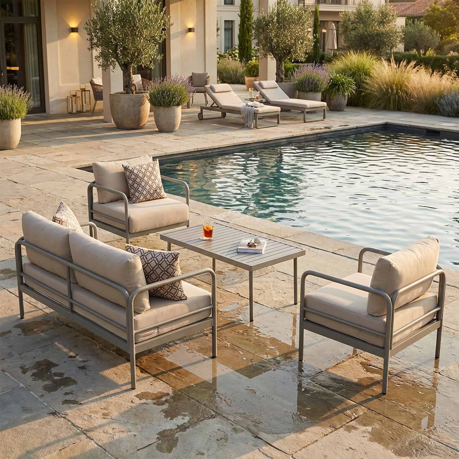 Het gelakte aluminium en de Olefin-stof zijn bestand tegen voortdurende blootstelling. De set neemt weinig ruimte in, maar zorgt voor een sterke sfeer.