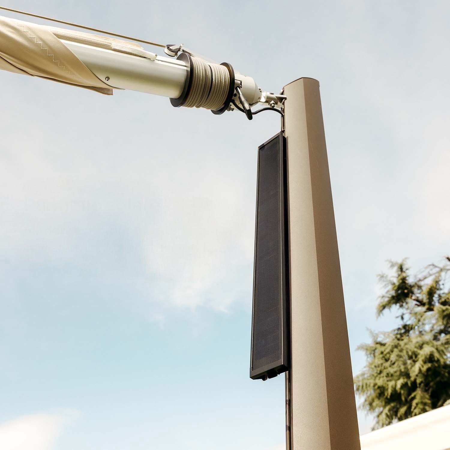 Maanta, een Italiaans merk dat gespecialiseerd is in schaduwoplossingen voor buiten, heeft Zefira ontworpen voor maximale autonomie via zonne-energie. Netstroom is alleen nodig als laatste redmiddel bij een volledig lege batterij.