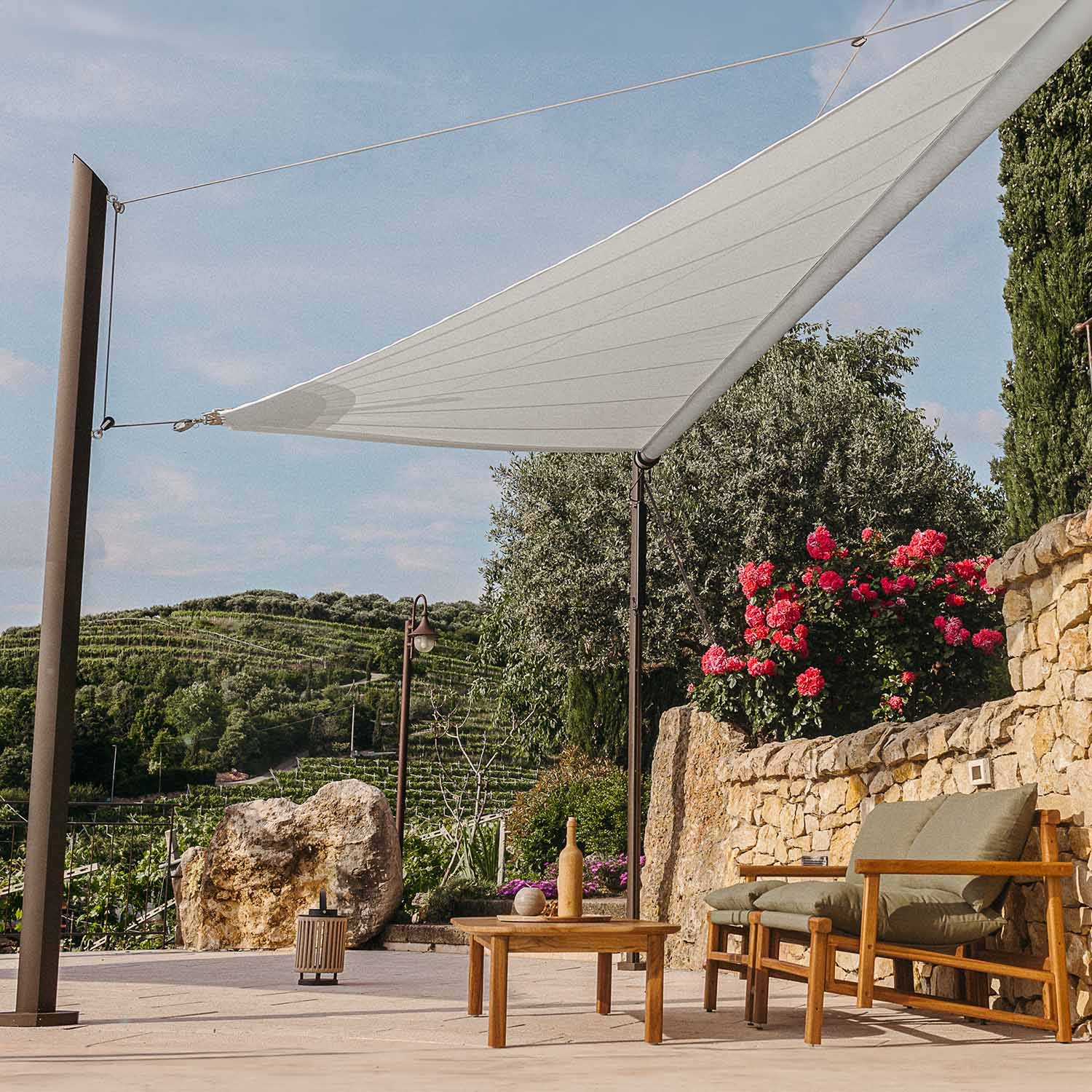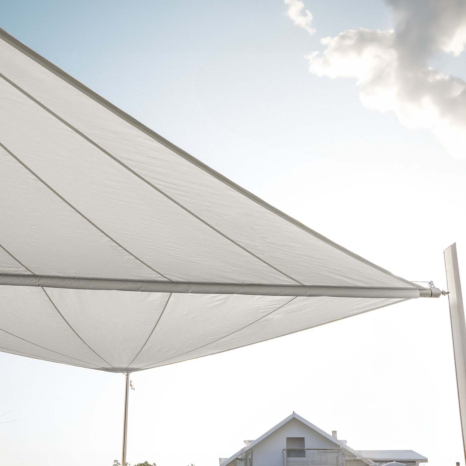 Het automatisch oprolbaar schaduwdoek Zefira kan het hele jaar blijven hangen. Roestvrij staal en de Purishade®-stof zijn bestand tegen regen, vorst en extreme weersomstandigheden. Maanta ontwerpt elektrisch oprolbare schaduwdoeken die lang meegaan. Seizoensgebonden demontage is aanbevolen, maar niet verplicht.