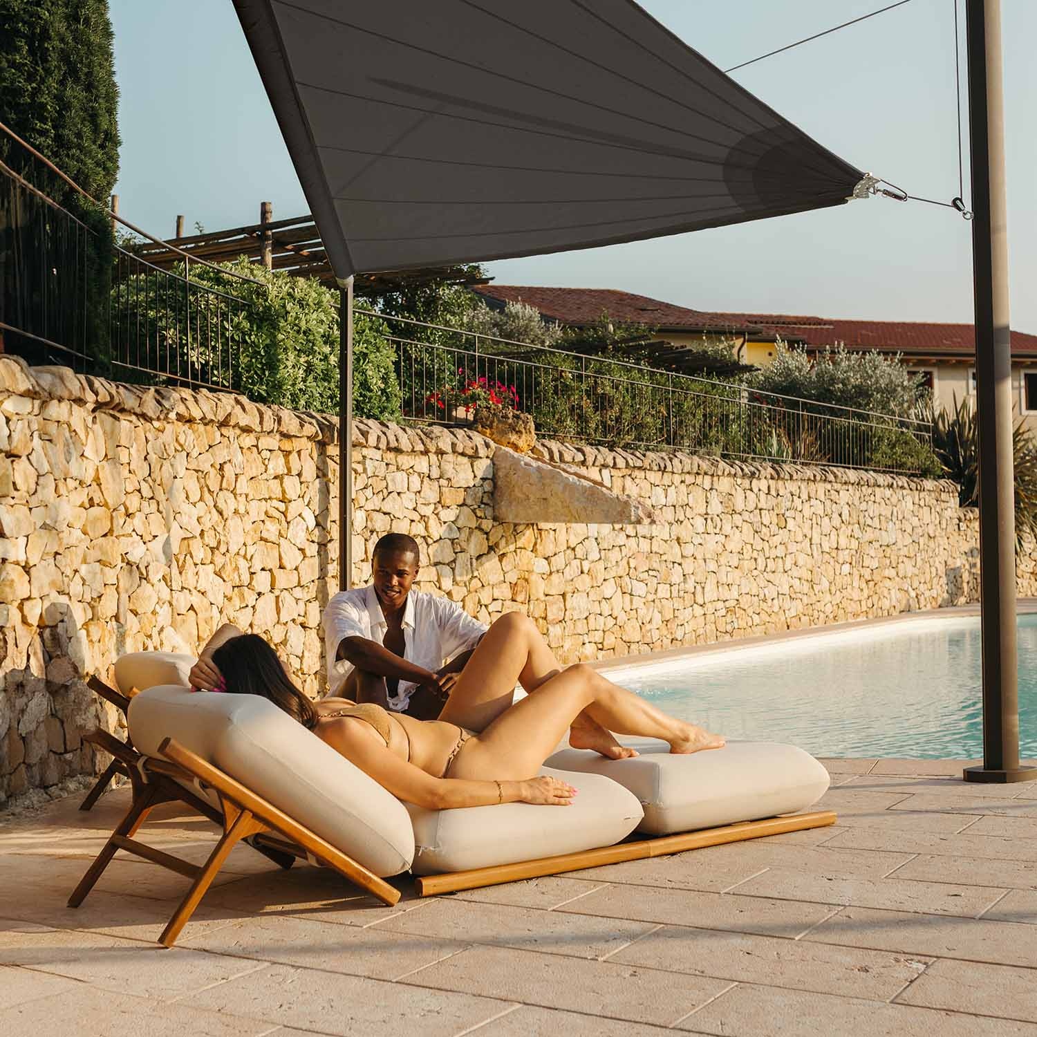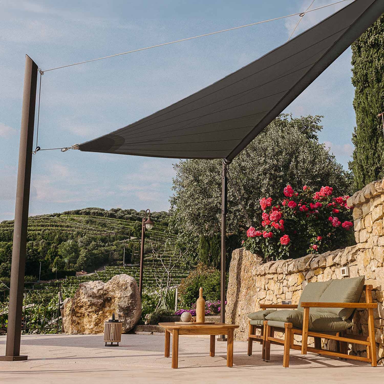 Het automatisch oprolbaar schaduwdoek Zefira kan het hele jaar blijven hangen. Roestvrij staal en de Purishade®-stof zijn bestand tegen regen, vorst en extreme weersomstandigheden. Maanta ontwerpt elektrisch oprolbare schaduwdoeken die lang meegaan. Seizoensgebonden demontage is aanbevolen, maar niet verplicht.