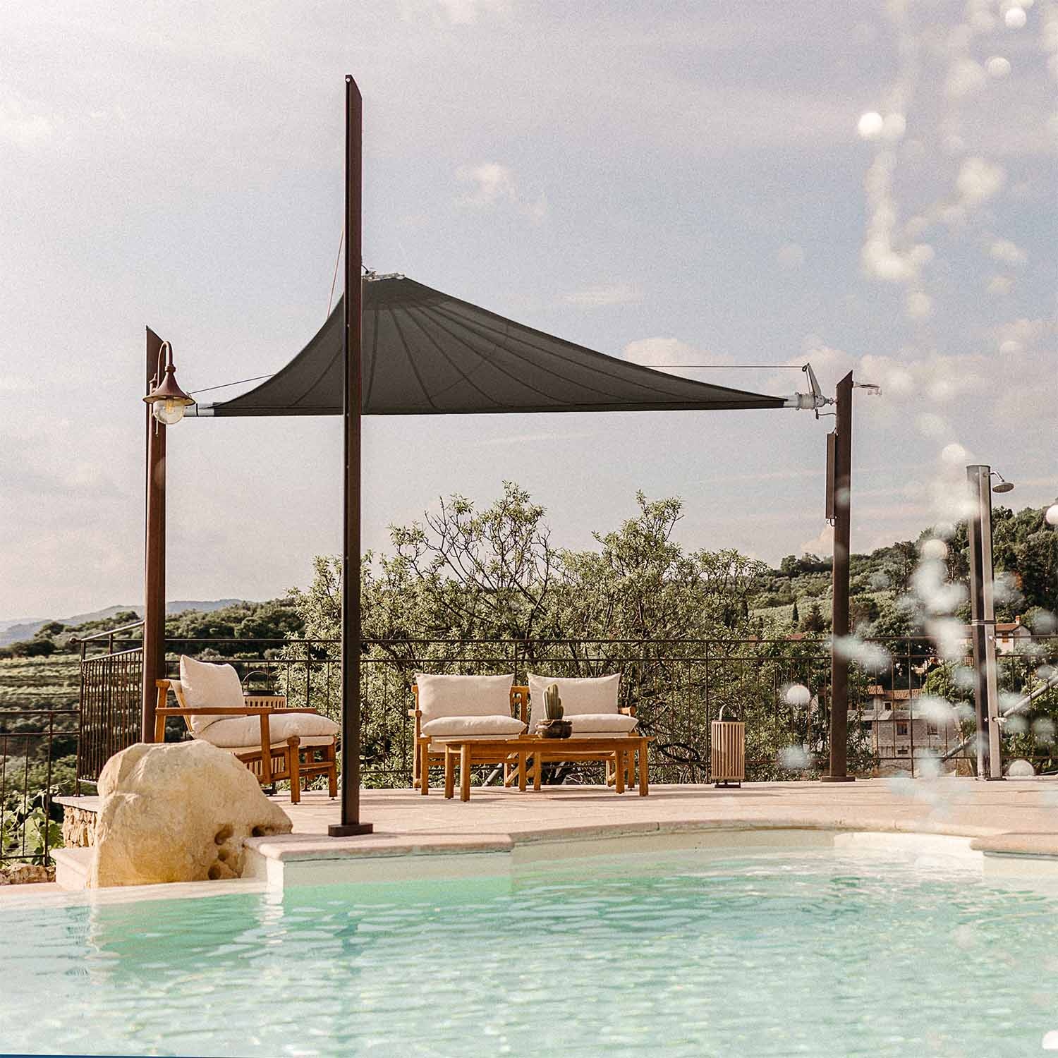 Dit automatisch oprolbaar schaduwdoek vereist palen die speciaal door Maanta zijn ontworpen en voorzien zijn van platen voor het motorische bevestigingssysteem. Als je al andere palen hebt, zijn deze helaas niet compatibel met Zefira.