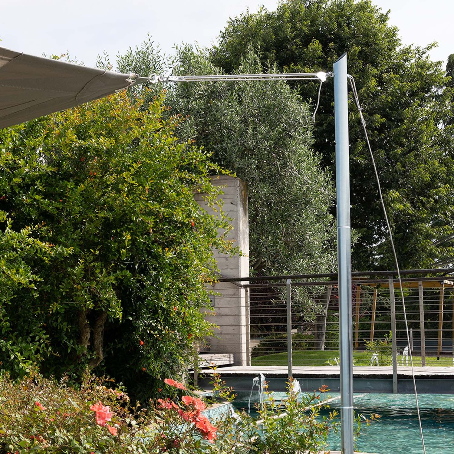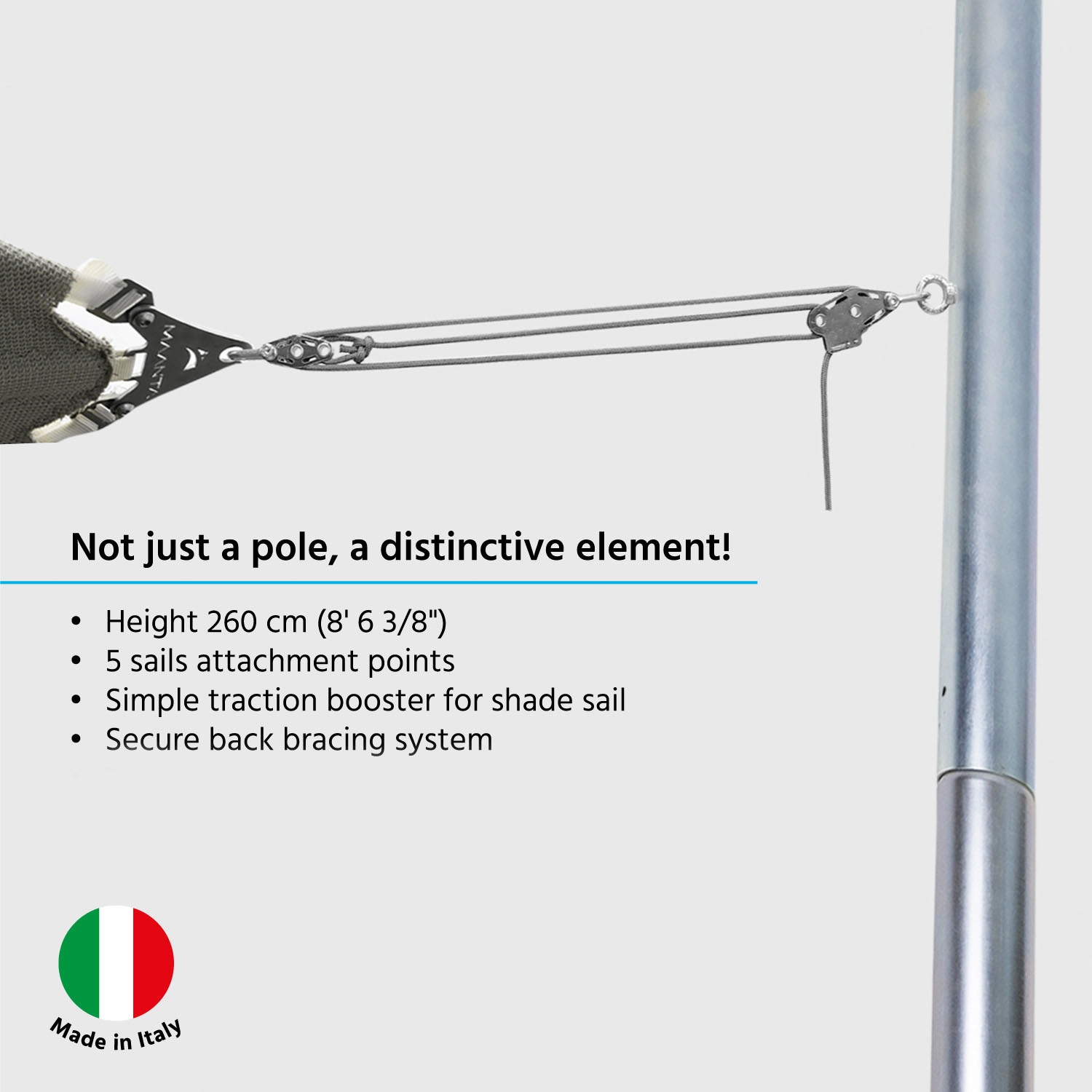Stel je voor: met slechts één enkele mast creëer je de perfecte schaduw in je tuin. Dankzij de 5 verstelbare bevestigingspunten pas je de schaduw volledig aan jouw wensen aan, zodat je kunt genieten van een gepersonaliseerde schaduwzone – voor maximaal comfort en ultieme flexibiliteit. De robuuste constructie en het verfijnde design zorgen niet alleen voor stabiliteit en duurzaamheid, maar geven je buitenruimte ook een elegante uitstraling. Transformeer je buitenruimte in een oase van ontspanning met een mast die functionaliteit, design en gebruiksgemak combineert.