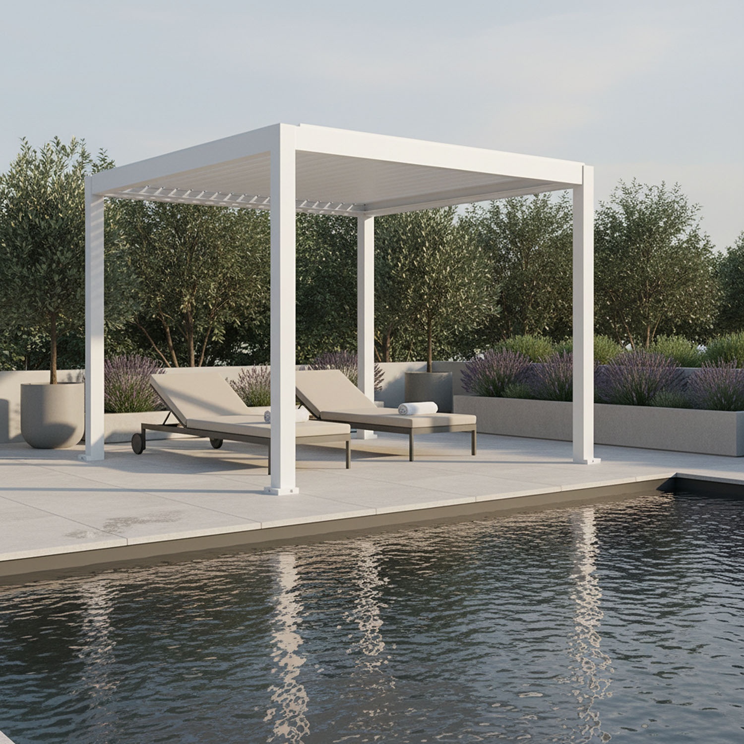 Lyra T6 is een bioklimatische pergola met verstelbare lamellen van 0° tot 100°, die in elke positie stevig blijven staan.