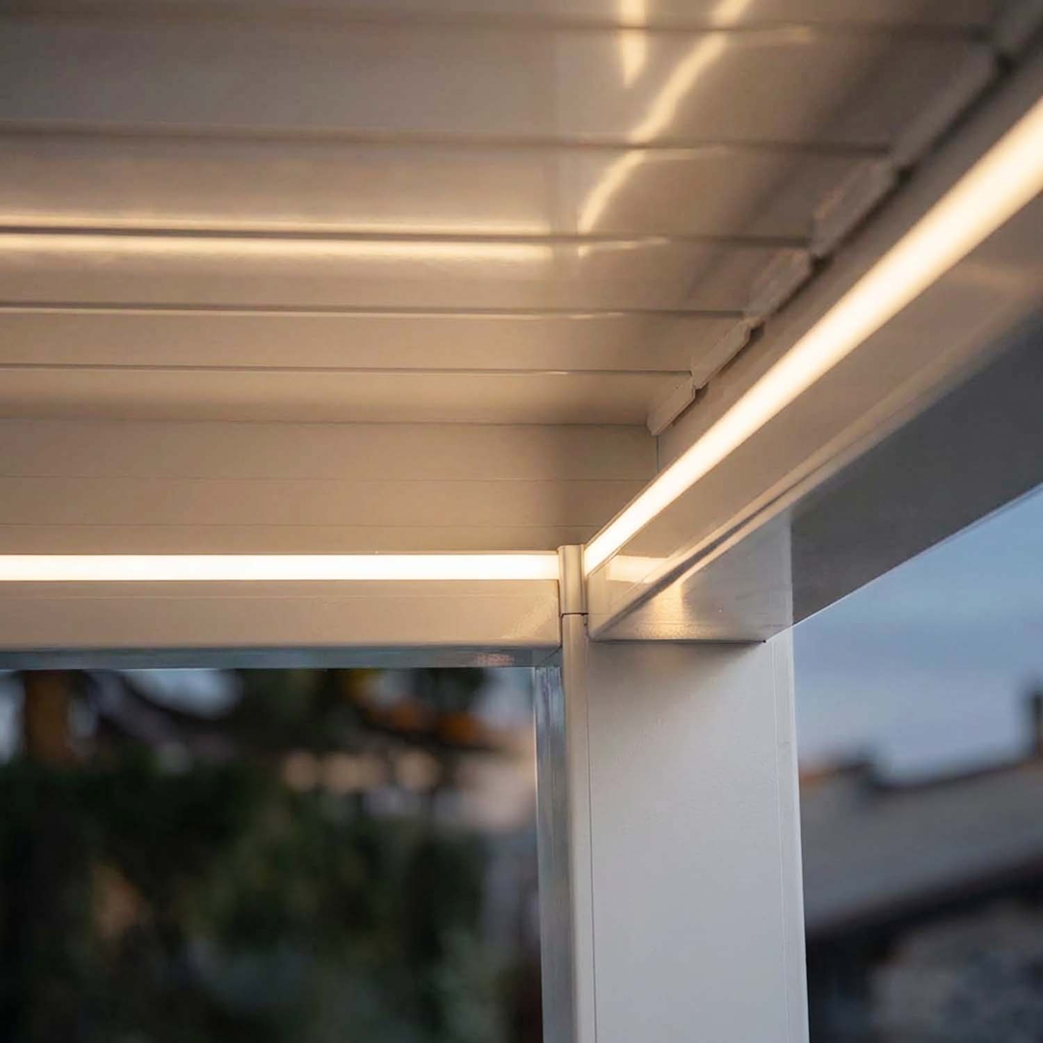 Het energieverbruik van de motor is minimaal: hij wordt alleen geactiveerd tijdens het openen of sluiten van de lamellen (ongeveer 20 seconden) en verbruikt in standby minder dan 1 W. De LED-verlichting rondom verbruikt ongeveer 15–20 W per meter tijdens gebruik. Voor een pergola van 3 × 3 m met 12 meter LED ligt het maximale verbruik bij volledige helderheid rond 180–240 W, vergelijkbaar met een reeks terraslampen.