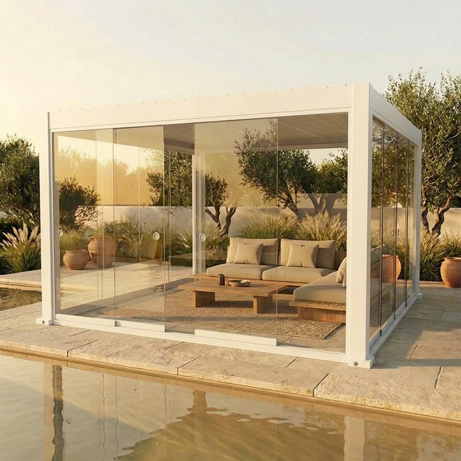 Een open pergola is prachtig in augustus. Maar in oktober, als de wind draait, blijft hij vaak leeg. De frameless glazen sluitingen voor Lyra T6 elimineren deze seizoensgebondenheid: het gehard glas van 10 mm houdt kou en regen buiten zonder het uitzicht te blokkeren.