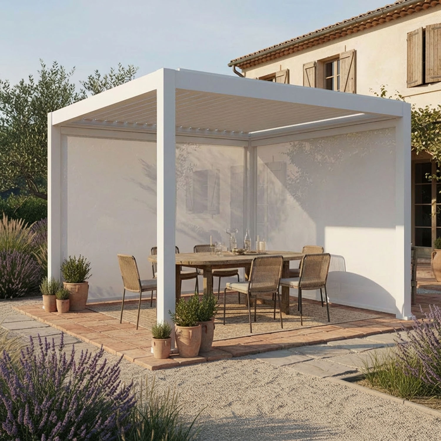 De doeklaag creëert een luchtkussen tussen de buiten- en binnenkant van de pergola. Het vermindert warmteverlies op koele avonden en verlaagt de gevoelstemperatuur tijdens de warmste uren. Ook de intensiteit van zijdelingse wind en geluid wordt gedempt.