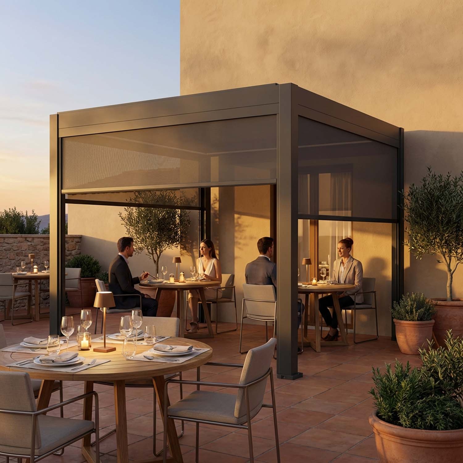 Verlengt het outdoor seizoen met maanden. Bescherming tegen insecten tijdens zomerse diners en een barrière tegen wind. Gasten blijven, tafels vullen zich.