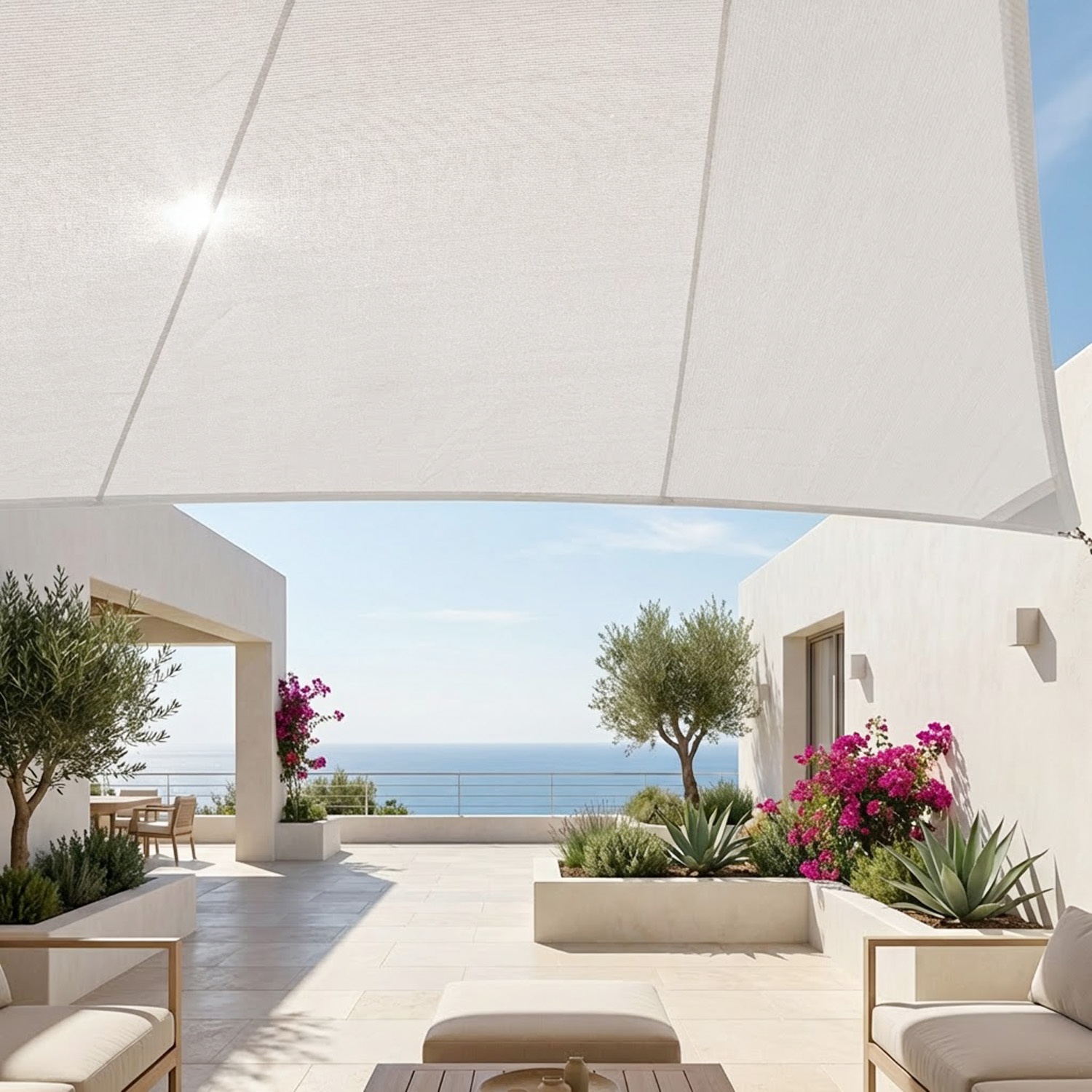 Het ademende zeil creëert een luchtige schaduwzone die beschut is tegen UV-stralen. Tegelijkertijd beschermt het tegen hagel en windvlagen.