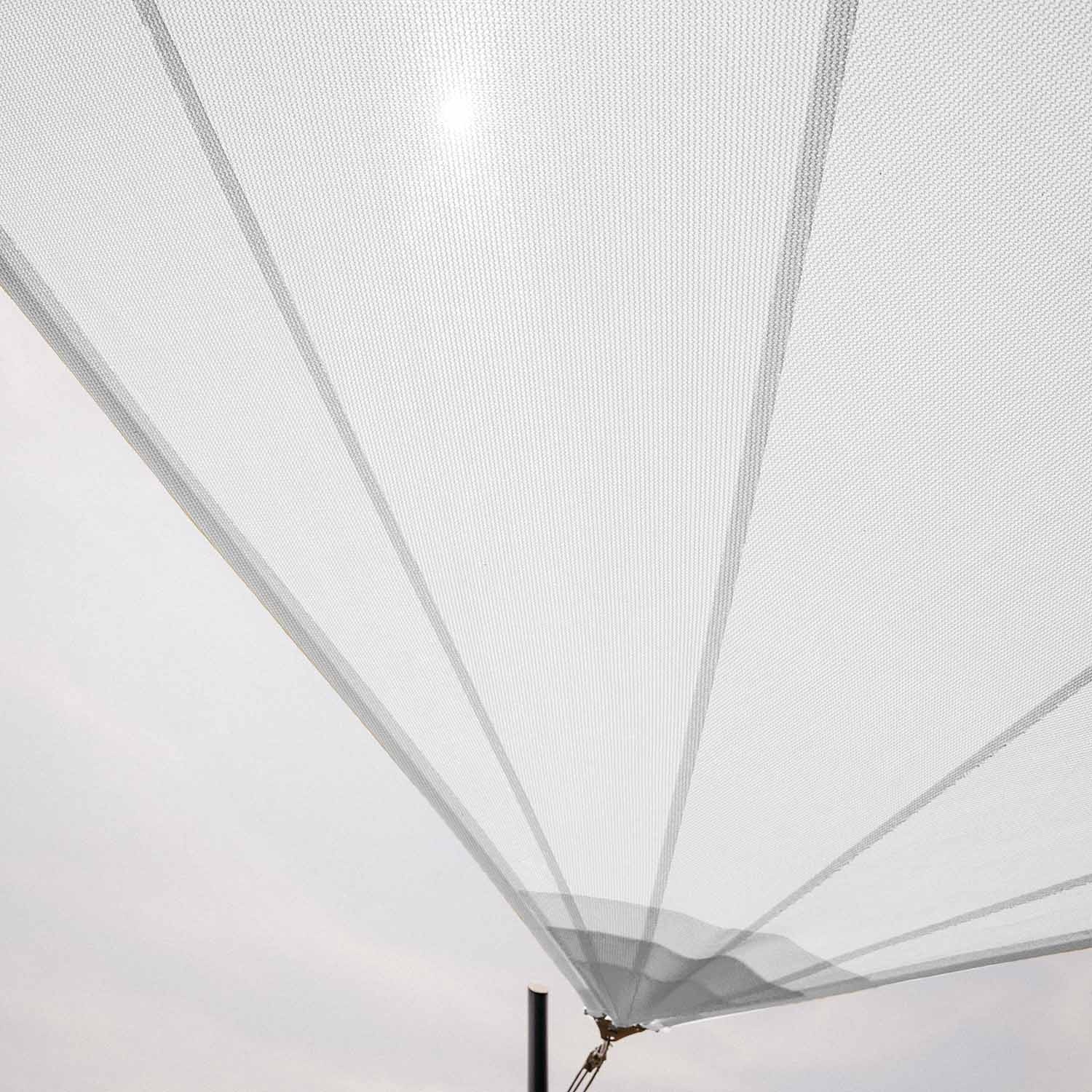 Solaria Ademende is een radiaal gesneden zonnedoek gemaakt van ademend Meshnet® HDPE 320 doek dat beschermt tegen intense hitte en hagel en beschermt tegen UV-straling en sterke wind.