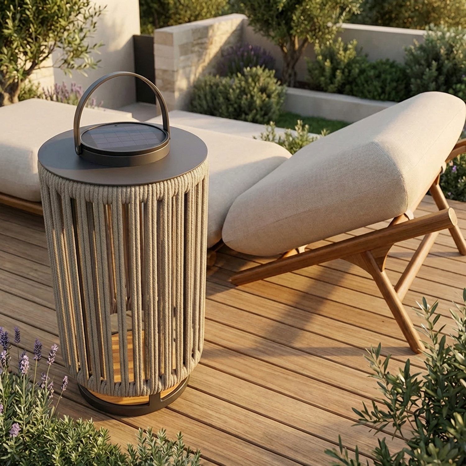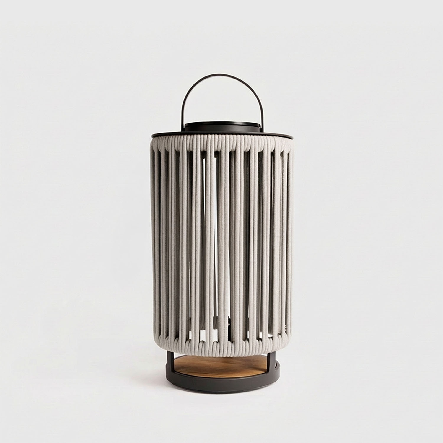 Marinea is een draagbare solar lamp met radiaal gevlochten nylon touw en een teakhouten basis.