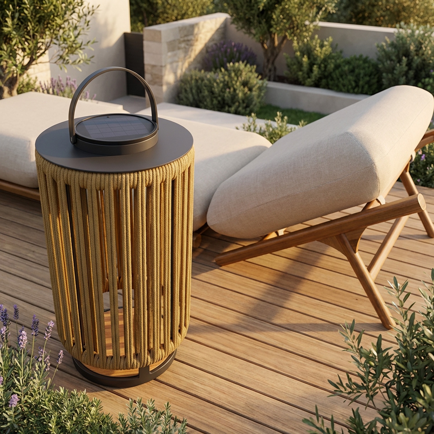 Marinea is een draagbare solar lamp met radiaal gevlochten nylon touw en een teakhouten basis.