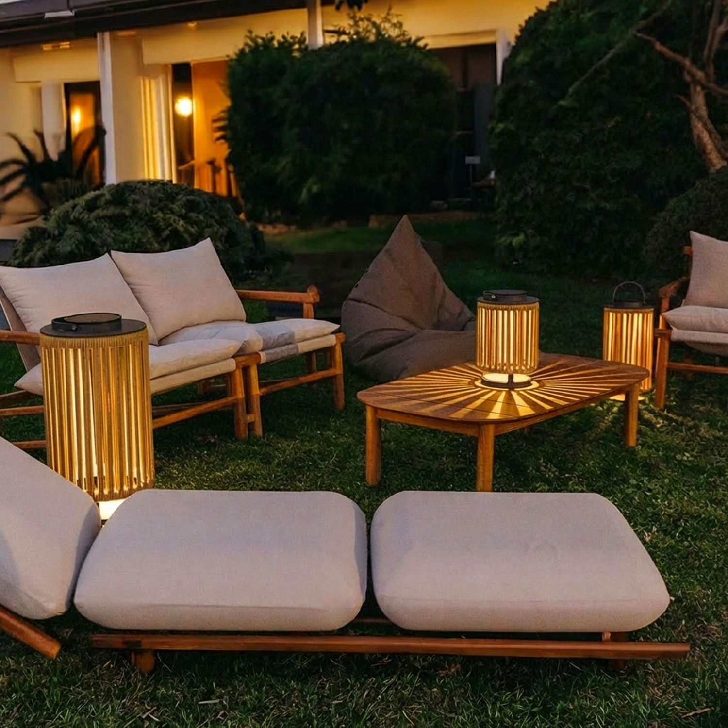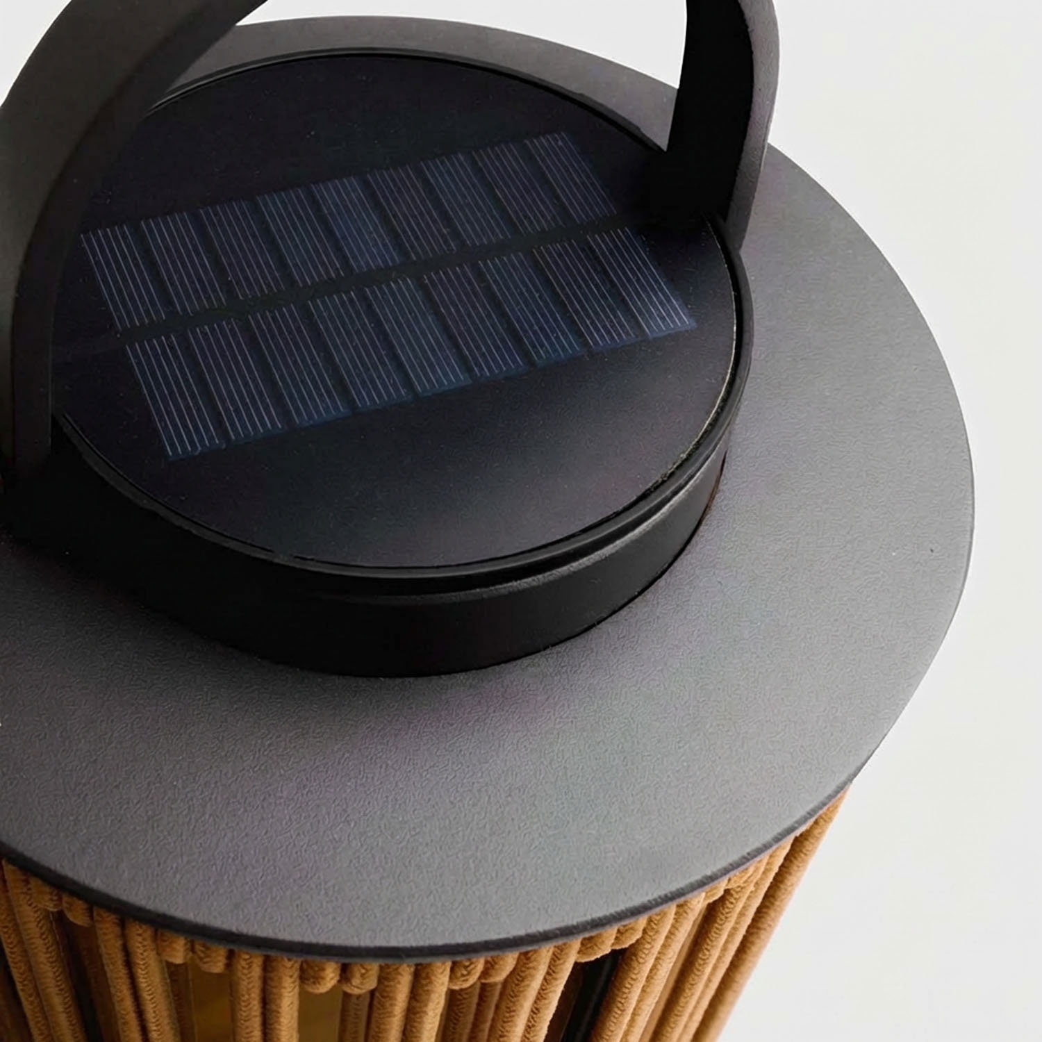 Het nylon touw is gevlochten volgens een precies radiaal patroon. Wanneer de LED oplicht, tekent elke lichtstraal die tussen de touwen door valt een stralend motief op de omliggende oppervlakken: de tafel, de muur, de tegels van het terras. Dit is geen toevallig effect. Het is geometrie toegepast op verlichting.