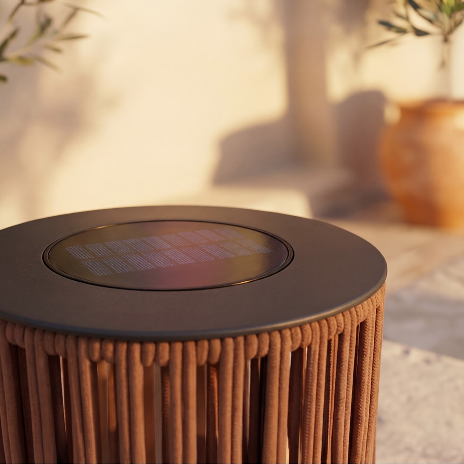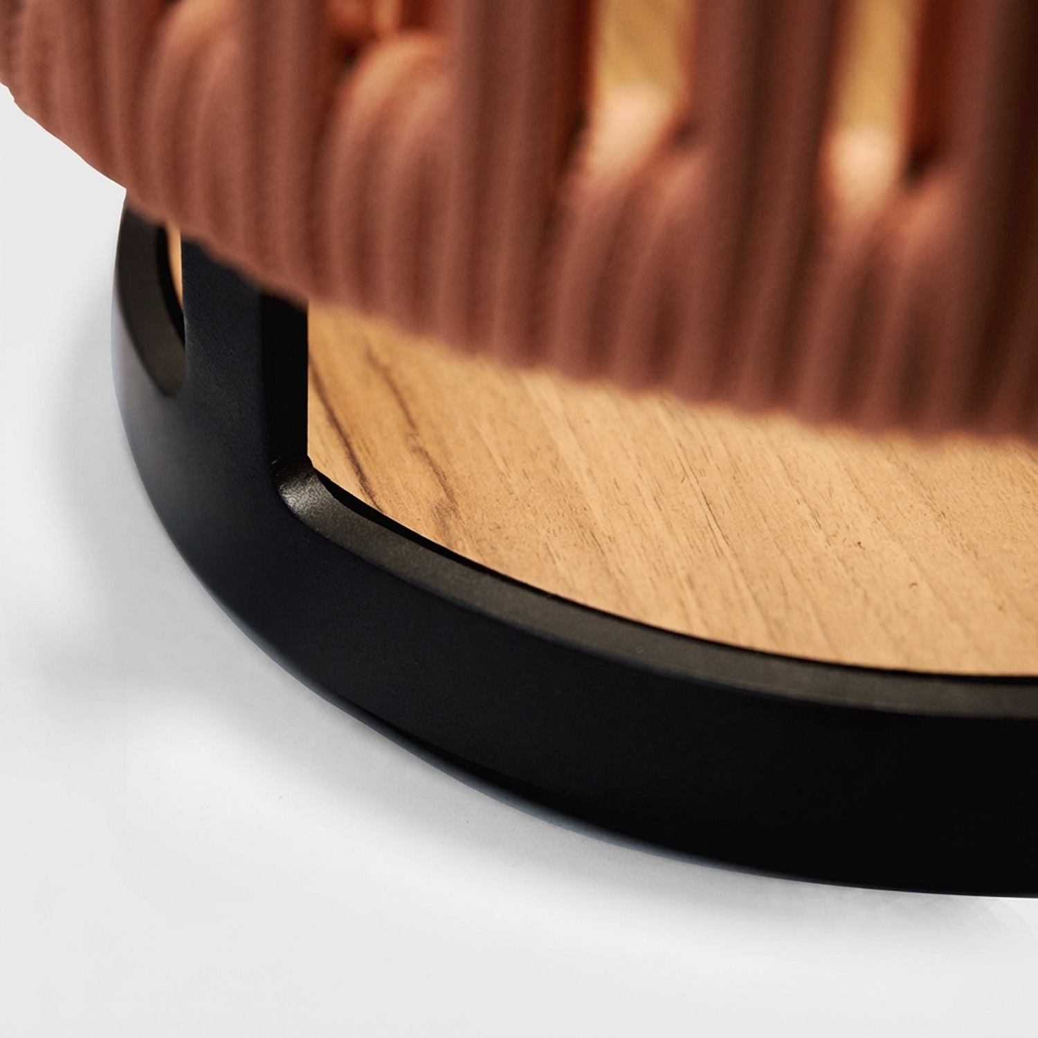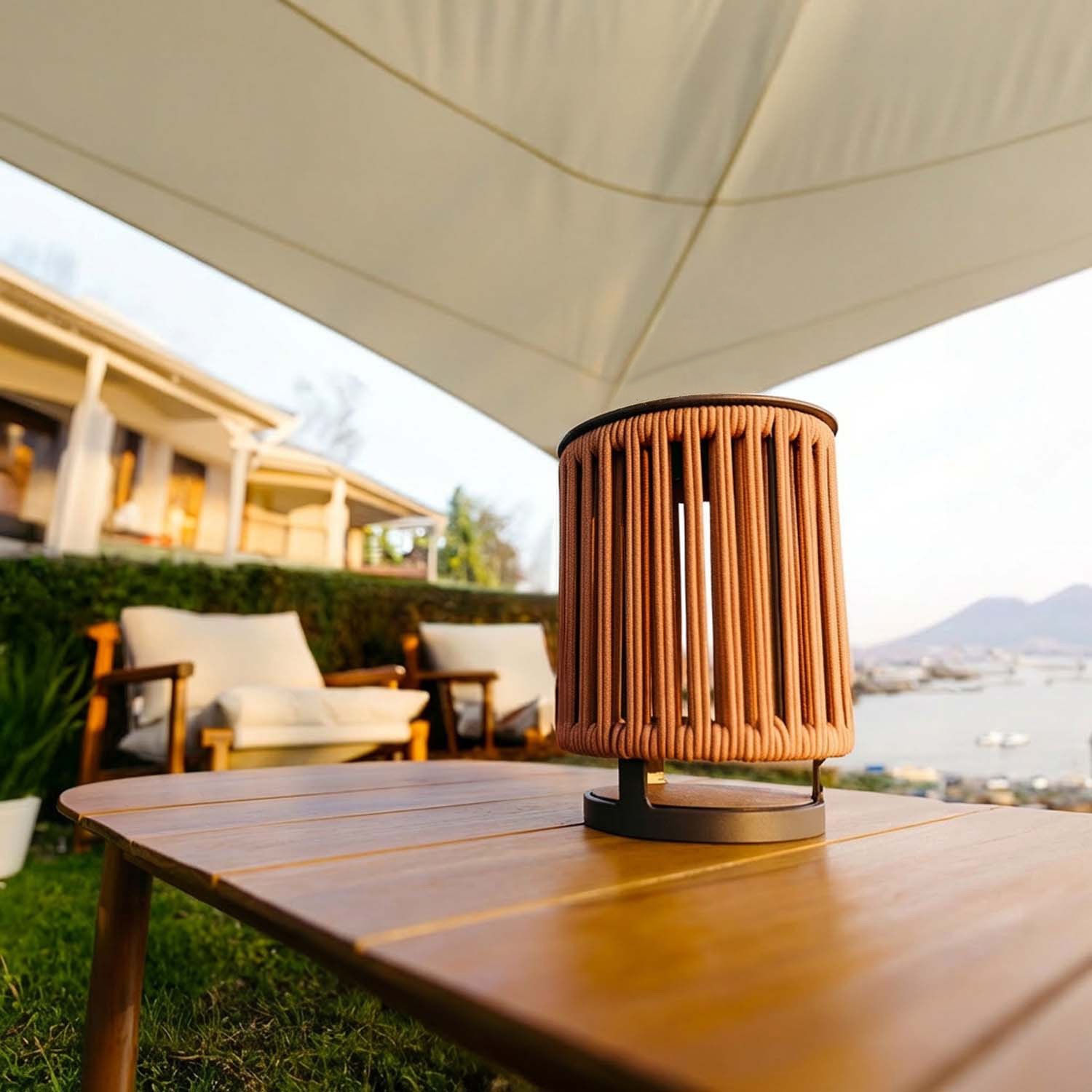 Hij heeft geen handgreep: dat is een bewuste ontwerpkeuze. De basis is ontworpen om stevig op zijn plaats te blijven, avond na avond, op traptreden, muurtjes en plantenbakken. Wanneer de lamp aangaat, filtert het touw het licht en werpt het lineaire, ritmische schaduwlijnen op de oppervlakken eromheen.